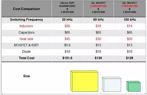 有了以上特性对比结果,我们可以清楚的认识到SiC MOSFET 性能全面优于Si MOSFET。虽然单个SiC MOSFET价格高于Si MOSFET,但是应用了SiC MOSFET的系统设备整体价格低于应用Si MOSFET的设备,原因在于SiC MOSFET各项优秀性能使得设备中的电容容值减小、电感降低、散热片面积和体积减少以及设备整体体积和成本明显减小。