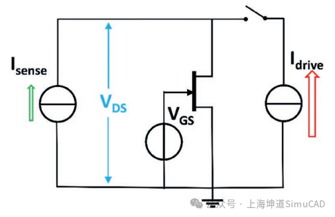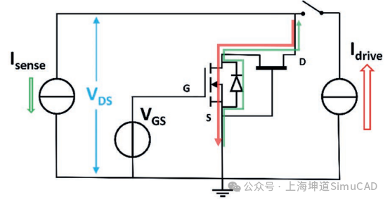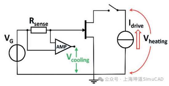 在冷却阶段,Vg设定为正电压。二极管D1反向偏置;因此,电压源对栅极-源极电压没有影响。测试电流Isense可以流过栅极二极管。