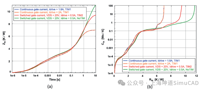图4a显示了瞬态热阻抗曲线Zth,即通过施加的加热功率归一化的结瞬态响应。图4b显示了结构函数,即沿着从结到环境的热流路径的热阻和电容二维图。对应于两种测量模式的曲线在两种视图中都拟合得很好,直到热量传播到器件的封装内。由于器件和冷板之间的各种热界面,曲线分离仅发生在外壳表面。