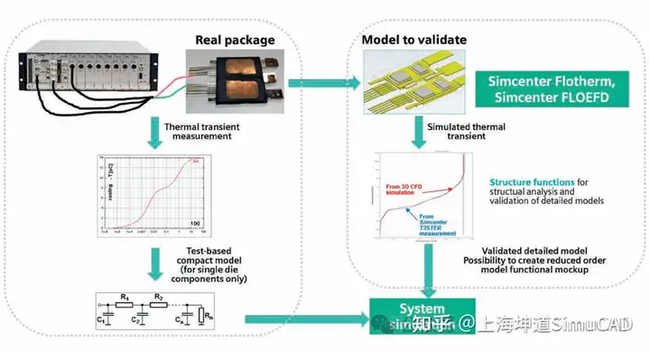 西门子提供了一种独特的无损测试解决方案 —— Simcenter T3STER SI 热瞬态测试仪,通过非破坏性地测试封装好的半导体器件的电压随着时间的瞬态变化,快速地获得准确的、重复性高的结温热阻数据以及结构内部信息,测试结果可以生成热阻热容模型(R-C 网络模型)供热仿真软件使用,可以校准详细的仿真模型。