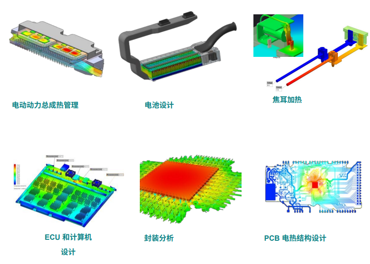 电子冷却、预测芯片温度、PCB 热管理、带散热器的机箱设计、车架热传递、发动机舱高温环境的影响、热辐射影响、导入EDA数据 、界面材料导热特性。
