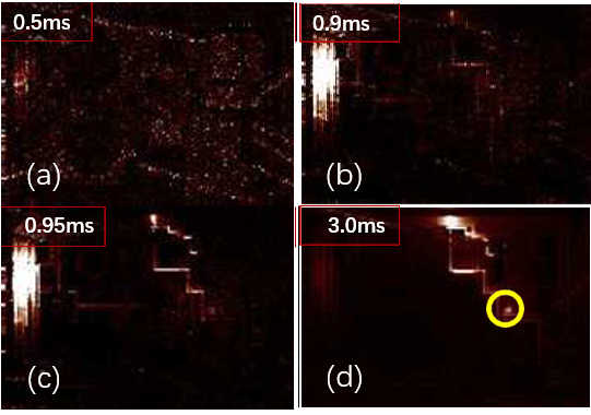 图3为四个不同加热时间(从0.5毫秒到3.0毫秒)下的瞬态热成像图。施加偏置脉冲后,芯片左侧几乎立即开始发热(图3a),并在约0.9毫秒时达到峰值(图3b)。到0.95毫秒时,芯片上部位置的另一区域开始发热(图3c);在3.0毫秒时,芯片左侧已冷却,中央偏右侧又出现一个新的热点(图3d)。