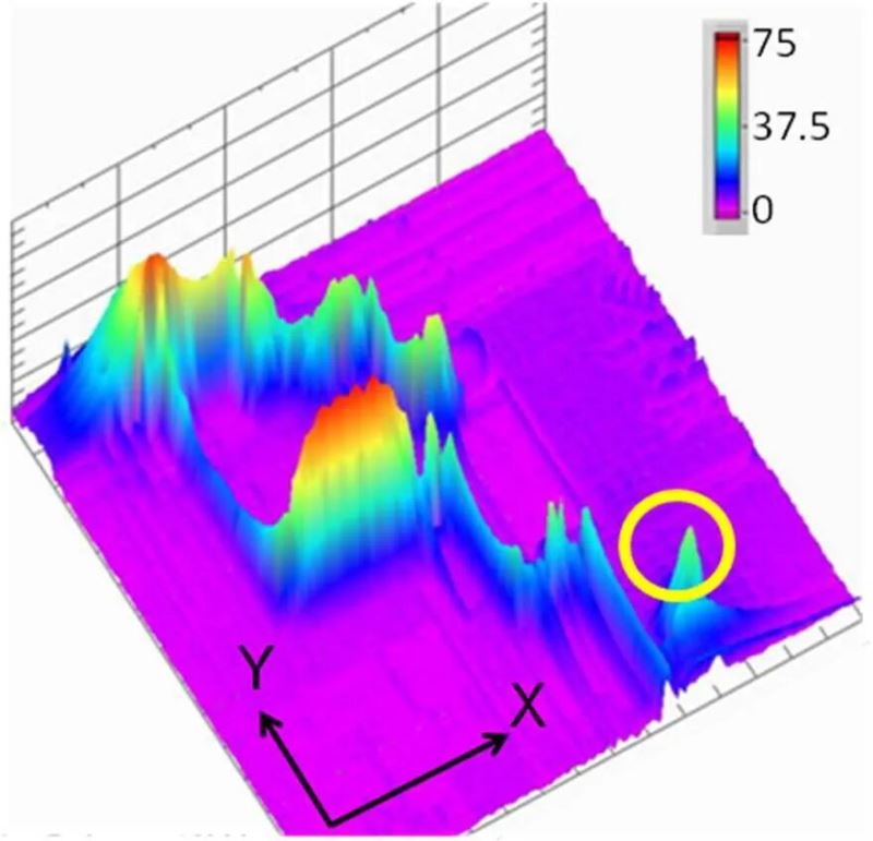 根据电路设计,最初器件左侧的发热是预期之内的,而在3毫秒时出现的发热则在意料之外,与闩锁效应有关。该位置在下图的3D温度图中圆圈标出。