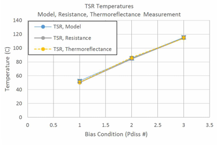 图1: 在三种不同功率条件下,Modeling, Resistance, Thermoreflectance的temperature sense resistor(TSR)的平均温度曲线对比图