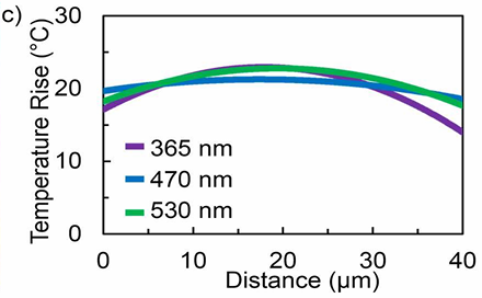 图2:GaN/Si HEMT的反射率热成像结果:a) 530 nm激励光源下栅极金属区域的温升;b) 365 nm激励光源下GaN沟道区域的温升;c) 沿栅极宽度方向的温升曲线,对比可见光与紫外光源下的结果。