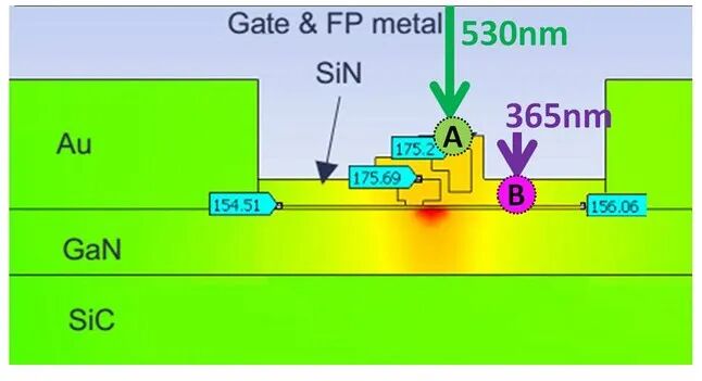 随后,研究人员测试一个商业化的 0.25 µm GaN/SiC HEMT,使用紫外光在GaN沟道侧进行测量,使用530 nm可见光在场板顶部进行测量,并将测试结果进行对比。图3给出了不同波长光源下探测区域的示意图。