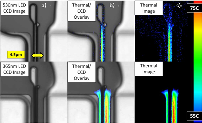 图4:a) GaN/SiC HEMT 530 nm可见光与365 nm UV TR热成像结果;b) 热成像图叠加在CCD图像上;c) 热成像图可以通过调节比例尺突出发热位置。
